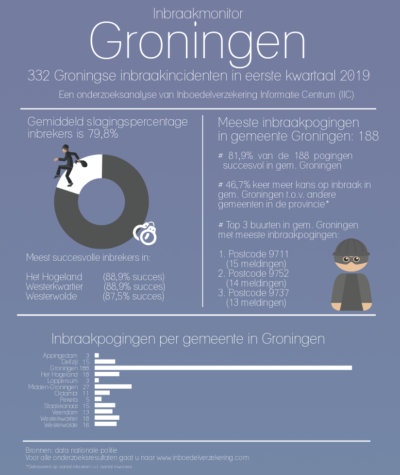 In het eerste kwartaal van 2019 werden in de provincie Groningen minder inbraakpogingen gedaan dan in dezelfde periode een jaar eerder. Begin 2019 werd 332 keer een inbraakincident gemeld bij de Groningse politie, terwijl er in dezelfde maanden in 2018 nog 389 meldingen waren. Dit en meer blijkt uit bureauonderzoek van het Inboedelverzekering Informatie Centrum (IIC), op basis van de meest recente nationale Politiecijfers.