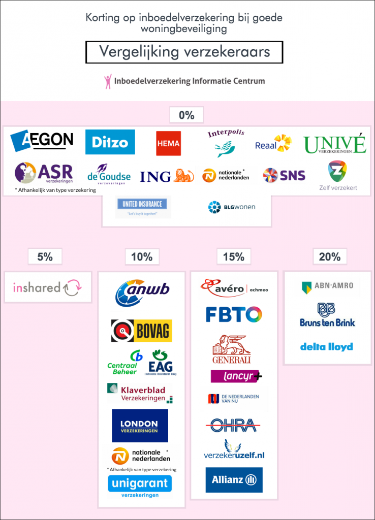 Kortingen op inboedelverzekeringen lopen bij verzekeraars uiteen van 5% tot 20%. De meeste verzekeraars bieden een korting van 10% of 15% (beiden 8 verzekeraars) wanneer de nodige veiligheidscertificaten zijn behaald. ABN AMRO, Bruns ten Brink en Delta Lloyd bieden het hoogste kortingspercentage (20%) aan consumenten die inbraakwerende maatregelen hebben genomen. Verzekeraar Inshared biedt een kortingspercentage aan van 5% wanneer de benodigde certificering is behaald. 14 van de 34 vergeleken verzekeraars bieden geen korting aan op de inboedelverzekering.